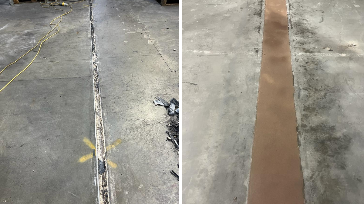 To fix it: First, clean and dry the joint well. Then, fill it with Jointex PU. This sealant is flexible and can handle heavy traffic and movement. For a clean finish, mask either side of the joint and pour the resin so it extends slightly above the top. Peel up the masking tape and, as it starts to cure, run a knife blade along the surface to cut off any excess material. The joint is now flush and smooth. This makes it less likely to catch on equipment, like digger buckets or forklift wheels. Don’t leave it too long, though – once the resin has fully cured, trimming it becomes a much tougher job!
